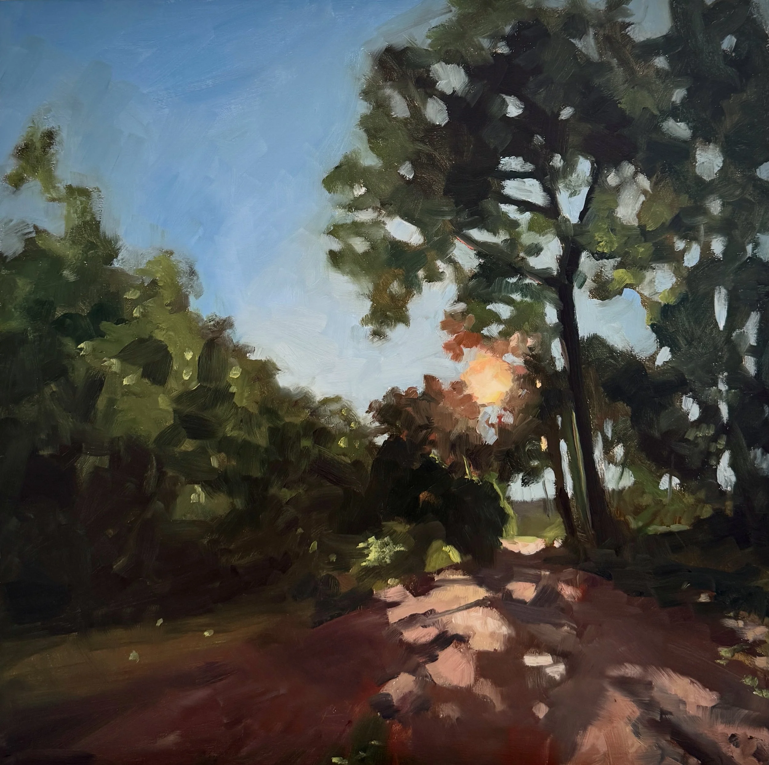 The landscape for Kirsten Elswood, feels like a homecoming. A childhood filled with outdoor adventures has made wild environments feel like places of safety. Her landscapes hold the viewer. They are often places of earthy darkness: a dense wood, a moorland den, a mossy grove. These landscapes give Kirsten and opportunity to explore a high contrast of light and dark: the way that light filters through close packed leaves and branches, casting dramatic shadows and allowing the viewer darts of brightness. These tonal extremes lend her paintings a tension. For as much as the landscape is a comfort, there is a darkness in its wilderness. The clouds rumble in, the light fades, a storm brews.
