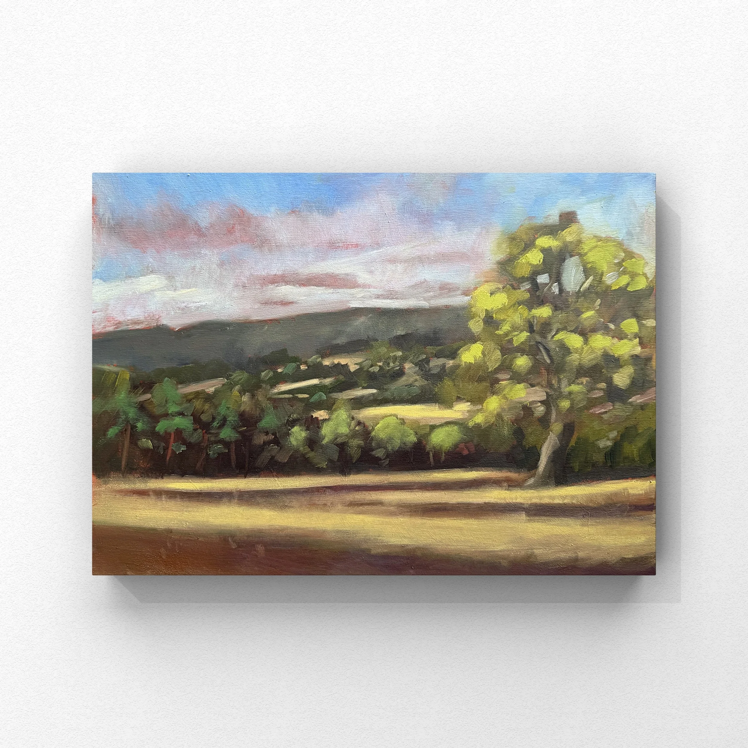 The landscape for Kirsten Elswood, feels like a homecoming. A childhood filled with outdoor adventures has made wild environments feel like places of safety. Her landscapes hold the viewer. They are often places of earthy darkness: a dense wood, a moorland den, a mossy grove. These landscapes give Kirsten and opportunity to explore a high contrast of light and dark: the way that light filters through close packed leaves and branches, casting dramatic shadows and allowing the viewer darts of brightness. These tonal extremes lend her paintings a tension. For as much as the landscape is a comfort, there is a darkness in its wilderness. The clouds rumble in, the light fades, a storm brews.
